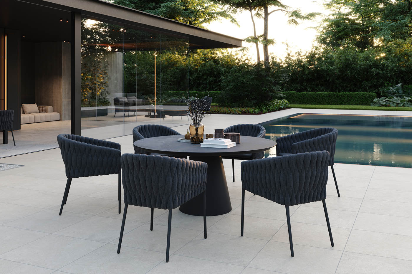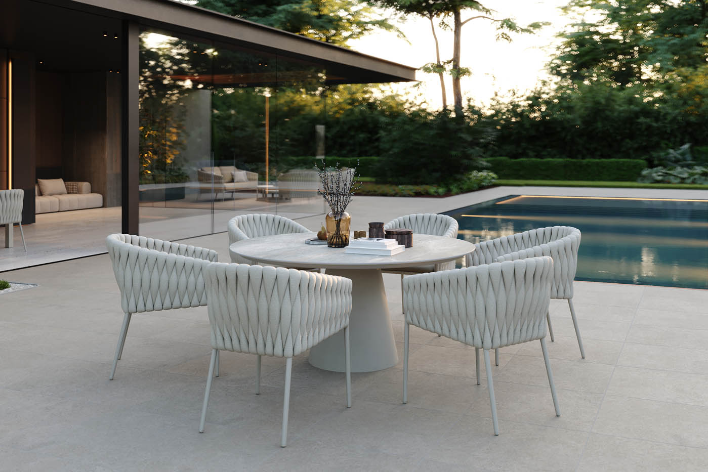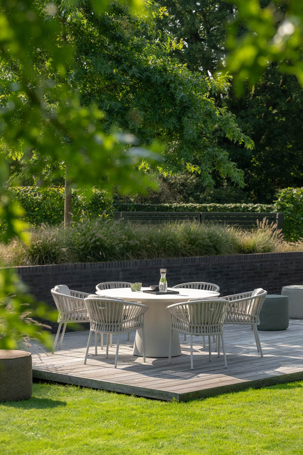 A Fortuna kerek étkezőasztal modern megjelenésével, prémium anyaghasználatával és időtálló formájával hódít. A masszív porszórt alumínium váz stabil alapot biztosít, míg a tetőlap választható kerámia vagy prémium teakfa kivitelben is, így a stílus és tartósság egyesül egyetlen darabban. Az asztal kerek kialakítása ideális a baráti vagy családi étkezésekhez a kertben, a teraszon vagy a medence mellett. A letisztult formavilág és a magas minőségű anyaghasználat révén minden alkalom valós élménnyé válik, legyen szó reggeli kávéról vagy esti vacsoráról.