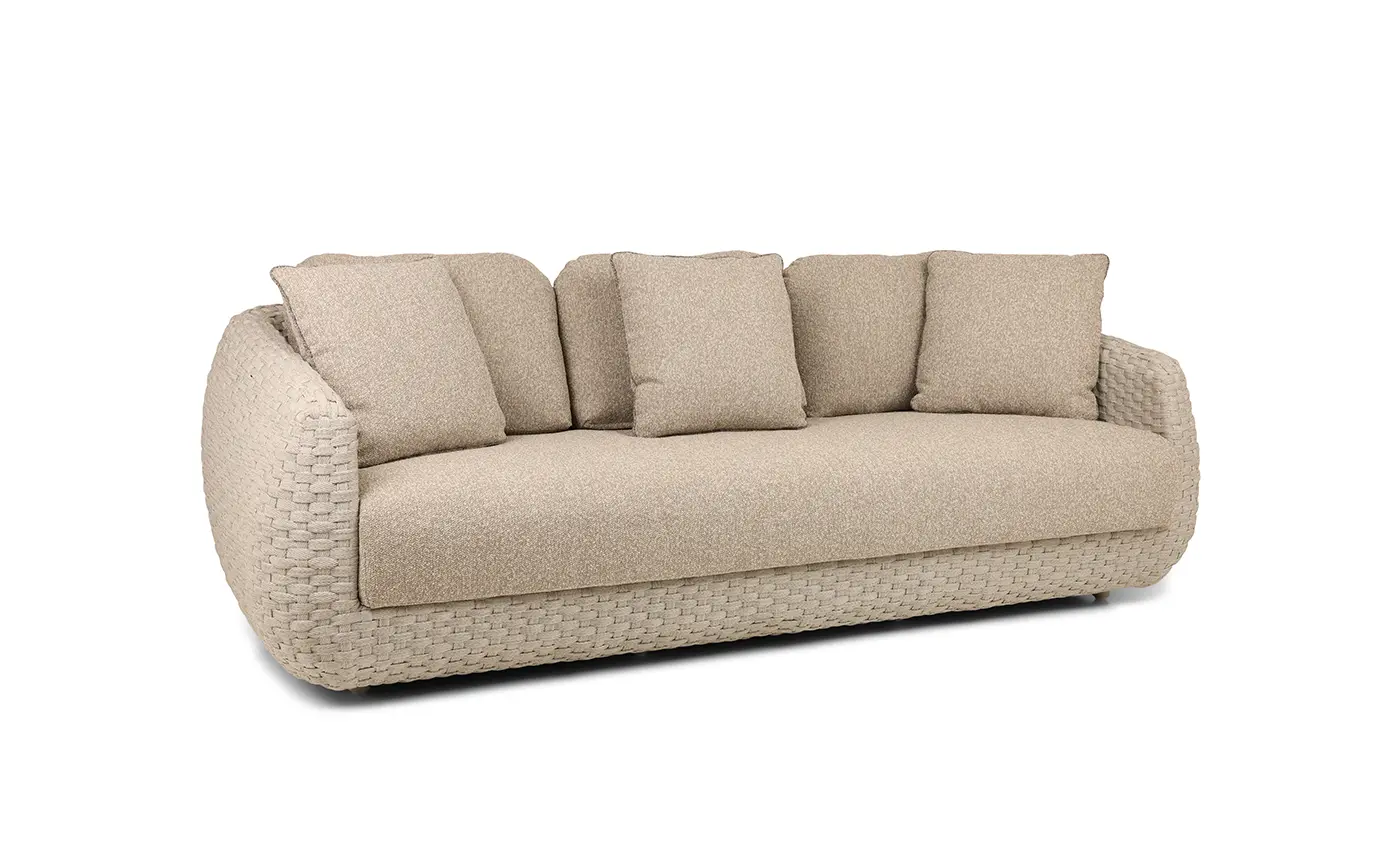 A Sassa 3 személyes szófa a letisztult elegancia és a maximális kényelem megtestesítője. Finoman megmunkált, dekoratív kötélfonott váza és a puha, natúr színű ülő- és hátpárnák természetes harmóniát teremtenek. Tágas, kényelmes ülőfelülete ideális a hosszú, pihentető beszélgetésekhez vagy a nyugodt délutáni kikapcsolódáshoz. A Sassa 3 személyes szófa tökéletesen összehangolt a kollekció többi darabjával, így egységes és stílusos megjelenést biztosít a teraszon vagy a kertben.
