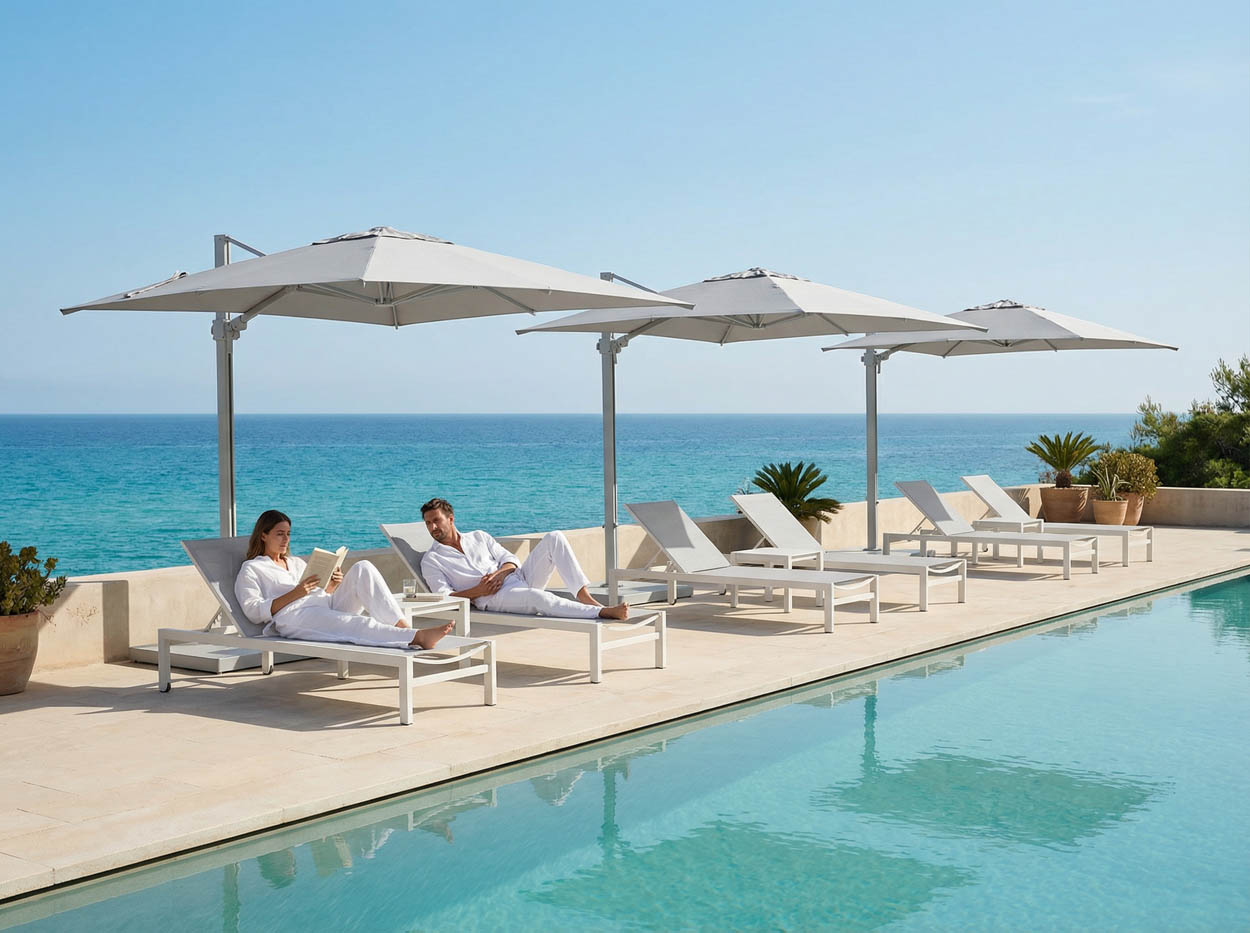 A Solux napernyő praktikus és hangulatteremtő megoldás kültéren. Beépített LED világítása kellemes, meleg fényeket biztosít a nyári estéken, így tökéletes légkört teremt a vacsorákhoz vagy baráti beszélgetésekhez. Erős alumínium váza stabil és időjárásálló szerkezetet nyújt, miközben modern, letisztult megjelenésével bármilyen környezethez illeszkedik. A kerekeken guruló alumíniumtalp könnyű mozgatást tesz lehetővé, így a napernyő egyszerűen áthelyezhető oda, ahol éppen szükség van rá.